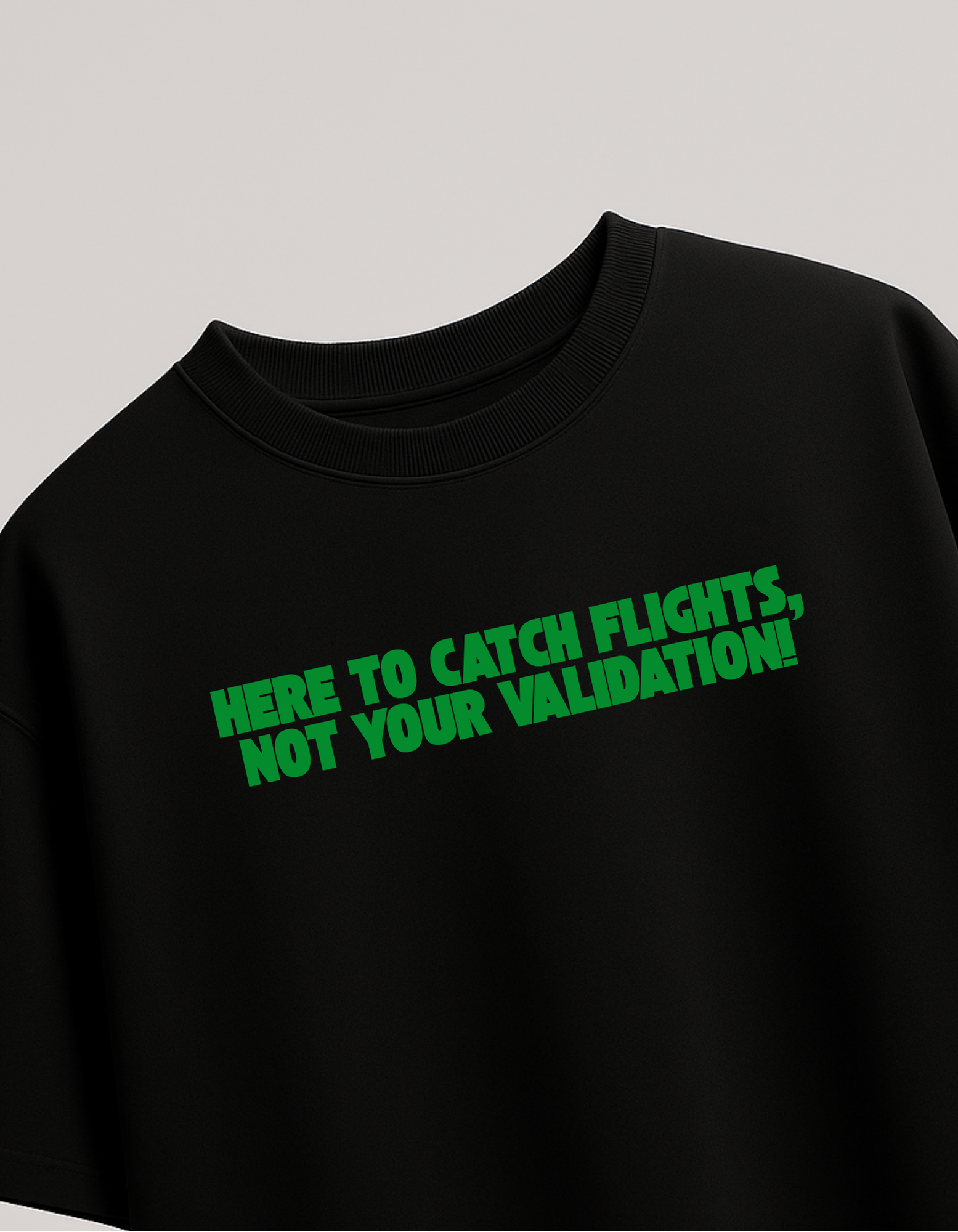 Here to catch flights, not your validation Oversized T-shirt is built for those women who love to chase their travel dreams and don't base it around seeking validation. They don't want to prove anything to anyone, just want to explore the world.